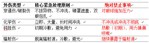 眼球穿通伤(如锐器刺伤、异物嵌入):不可拔出异物或冲洗,应用清洁材料遮盖伤眼,避免挤压,立即送往医院。