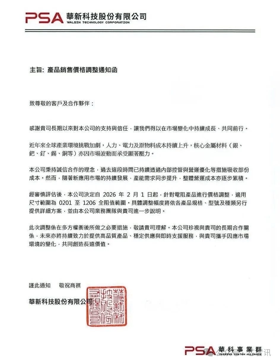 华新科技进一步指出,“此次调整是经过多方权衡后所做的必要措施,敬请贵司理解,本公司珍视与贵司的长期合作关系系。未来亦将持续致力于提供高品质产品、稳定供应与即时支持服务,与贵司携手应对市场环境的变化,共同创造长期价值。”